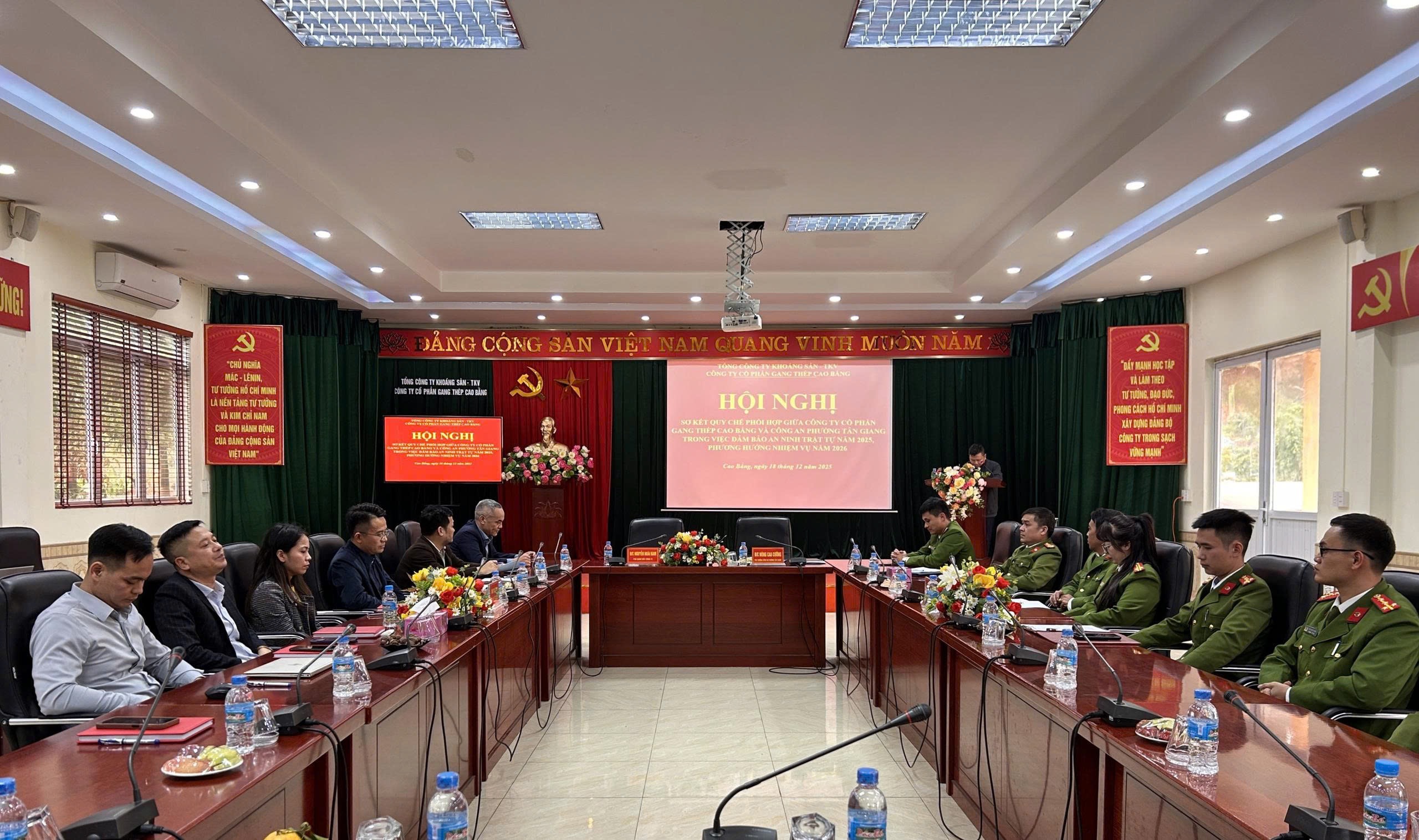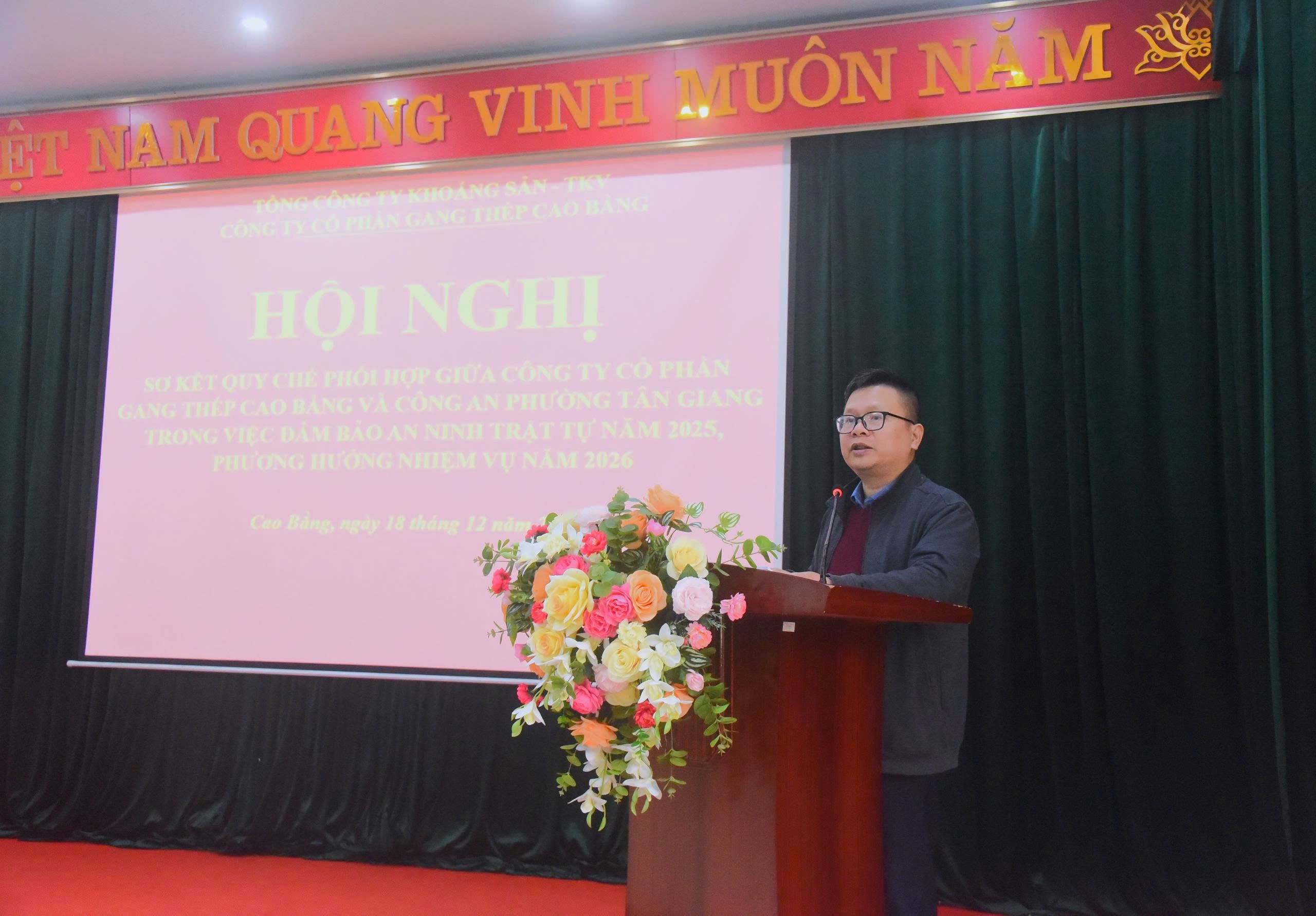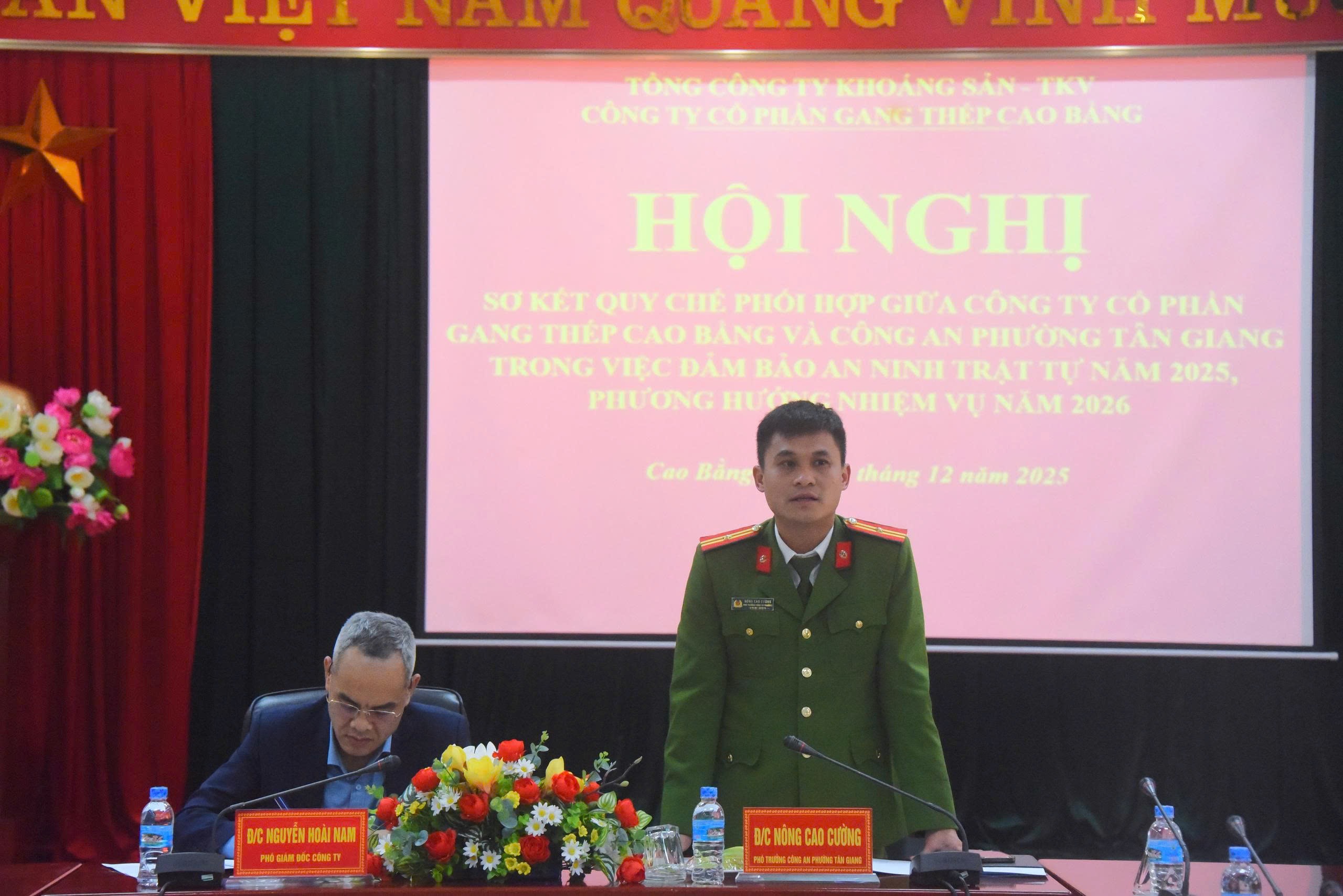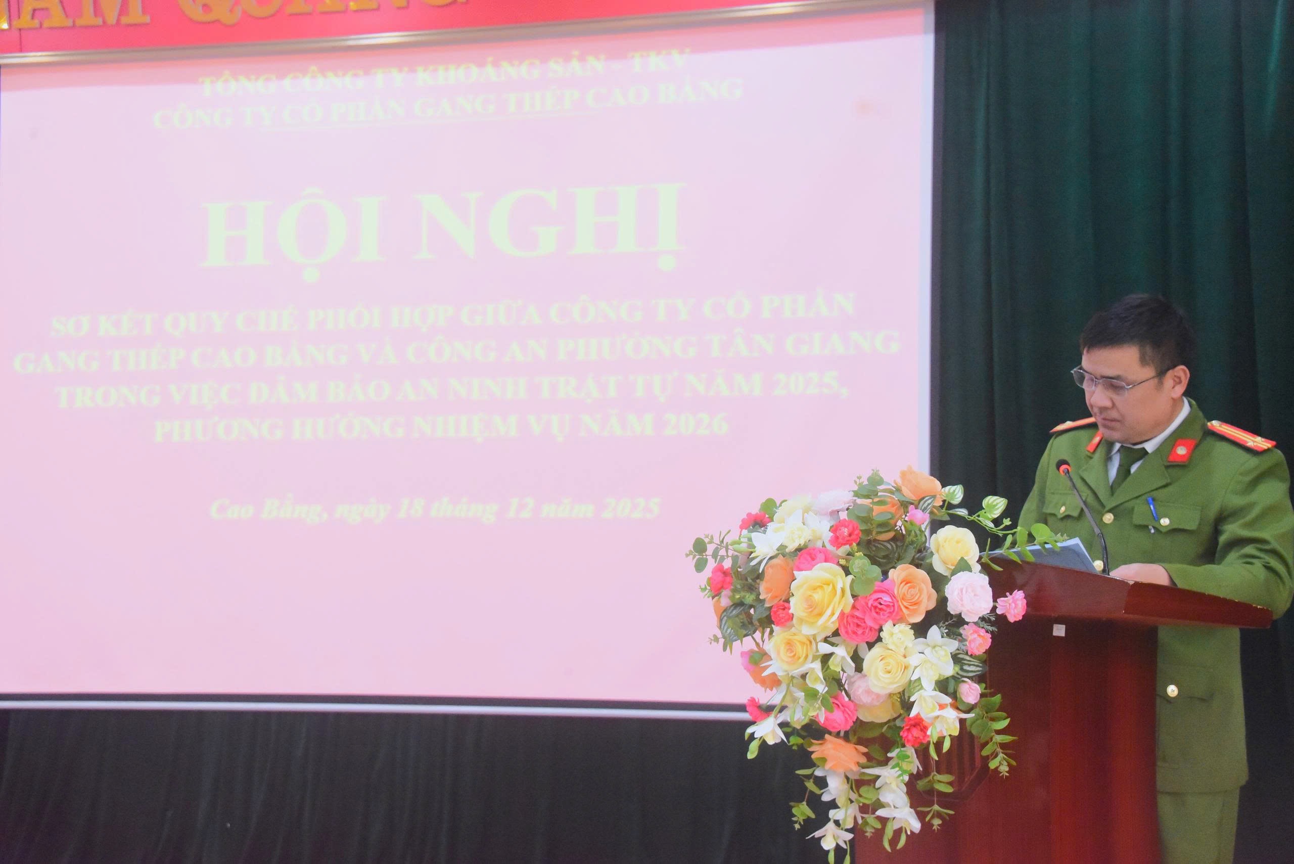 Nhằm đánh giá kết quả thực hiện quy chế phối hợp trong công tác đảm bảo an ninh trật tự (ANTT). Ngày 18 tháng 12 năm 2025, Công an phường Tân Giang đã phối hợp với Công ty Cổ phần Gang thép Cao Bằng tổ chức Hội nghị sơ kết quy chế phối hợp trong việc đảm bảo ANTT năm 2025, phương hướng nhiệm vụ năm 2026.