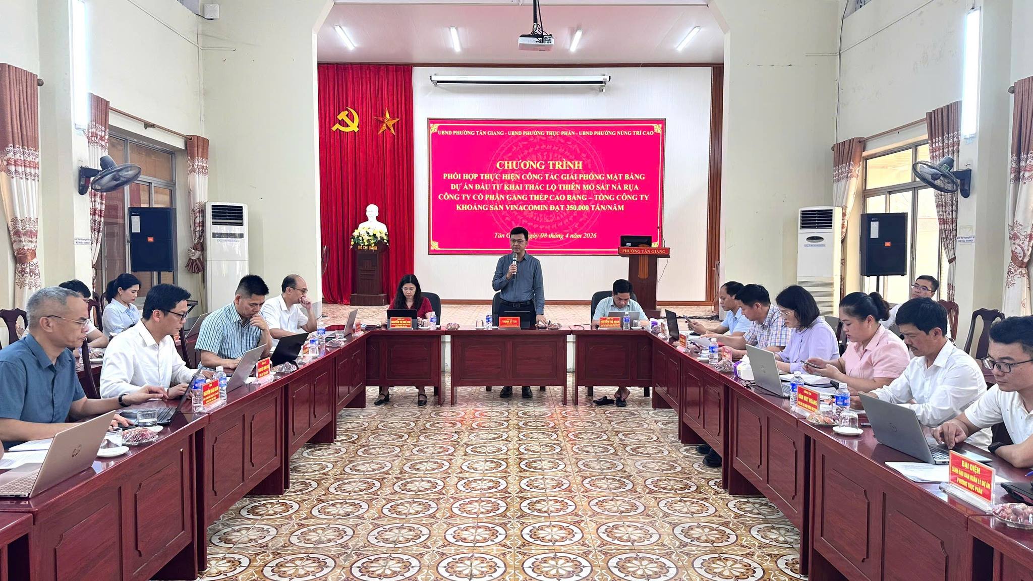 Chiều 08/4, tại hội trường UBND phường Tân Giang, 3 phường Tân Giang, Thục Phán, Nùng Trí Cao tổ chức chương trình phối hợp thực hiện công tác giải phóng mặt bằng (giai đoạn 1) Dự án đầu tư khai thác lộ thiên mỏ sắt Nà Rụa Công ty Cổ phần Gang thép Cao Bằng – Tổng Công ty Khoáng sản – Vinacomin với công suất 350.000 tấn/năm.